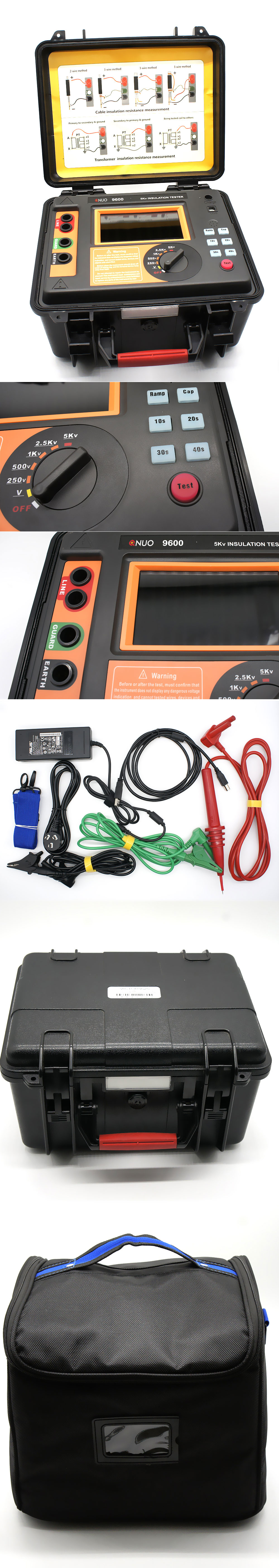 QNUO 9600系列高压绝缘电阻测试仪量程宽广,分辨率高,操作便捷,坚固耐用,准确可靠、性能稳定,抗干扰能力强。仪表具有绝缘电阻测试(IR);极化指数测试(PI);吸收比测试(DAR);斜坡测试(RAMP);滤波测试(10S、20S、30S、40S四种选择);电压测试(V);电容测试(uF);泄漏电流测试(nA),电压监视器,测试计时器等功能。仪器应用于电缆、电机、发电机、变压器、互感器、高压开关、避雷器等大型设备的绝缘电阻测试,能用于大容量高压电气设备、输电线路绝缘电阻的测试。是电力、电信、气象、机房、油田、机电安装和维修以及工矿企业供电部门常用而必不可少的仪表。