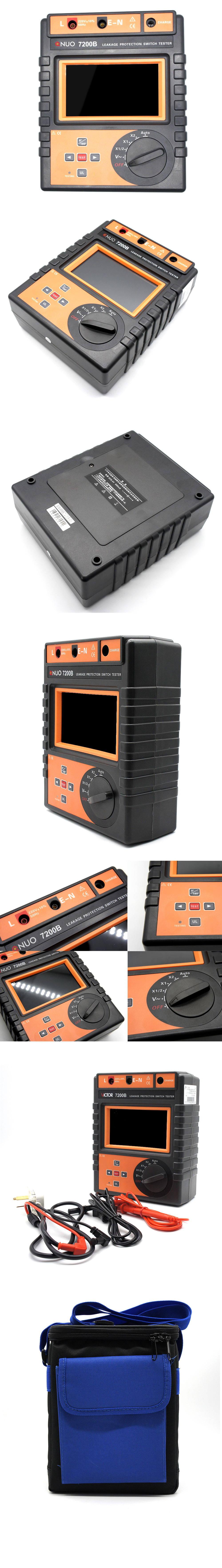 VICTOR 7200B漏电保护器测试仪专为现场在线测试各种漏电保护器的线路交流电压、漏电动作电流、漏电不动作电流、以及漏电动作时间,测试电流从5~1000mA分十六档(5、10、15、20、30、40、50、60、100、150、200、250、300、500、600、1000mA),测试漏电流动作时间量程为0~999ms,采用854480全彩触摸LCD显示,具有电池电量显示、设定故障电压指示、